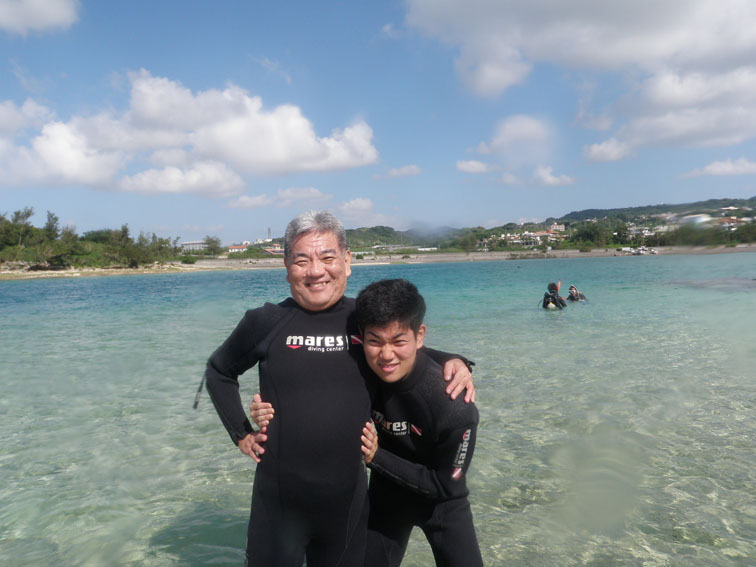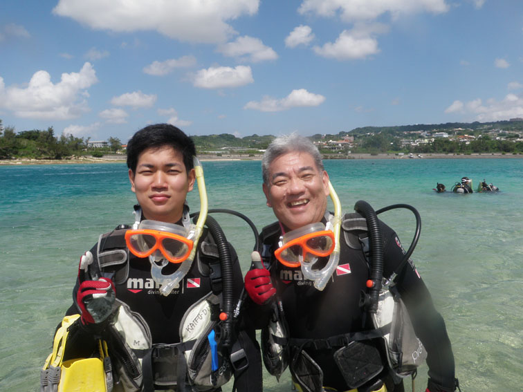 かつやさんは、ライセンスをお持ちなのですが、ご結婚以来潜られていないそうで、だいすけくんと一緒に体験ダイビングです。 とても明るくて楽しそうなご様子が写真からもうかがえますね~(^^)