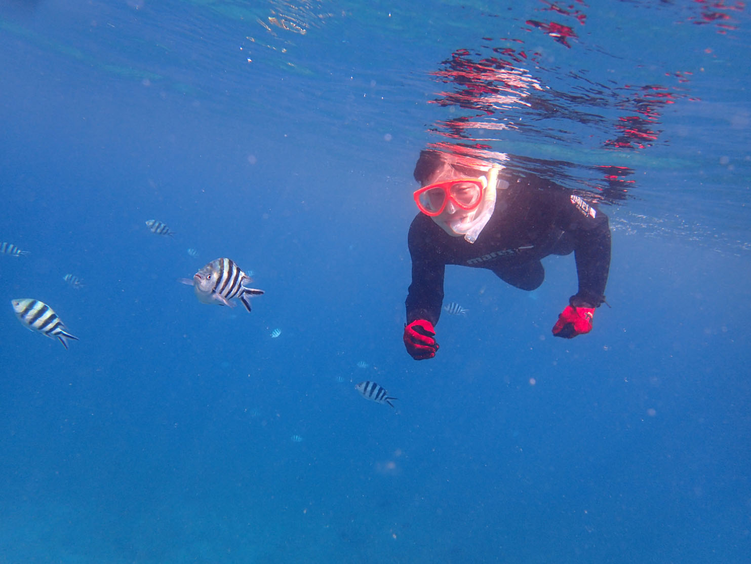 スノーケルは1回だけ、ダイビングは初めてだそうでしたが、元水泳部だそうで、余裕の泳ぎでしたよ。カクレクマノミに手を振ったりしていて可愛かったです(^^)
