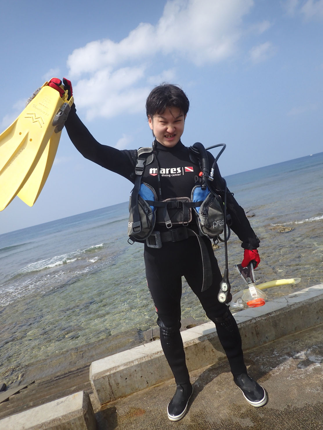 海風りぴーたーのたくやさん。 いつもは奥様のみかさんとご一緒でしたが、今回はお友達のてつやさんと一緒に遊びに来てくれました。てつやさんは初めてのダイビングということで、ダイバーのたくやさんも付き添いで一緒に体験ダイビングコース。 ん?でも5年ぶり?!そんなに空いちゃってたんですね・・・(^^;