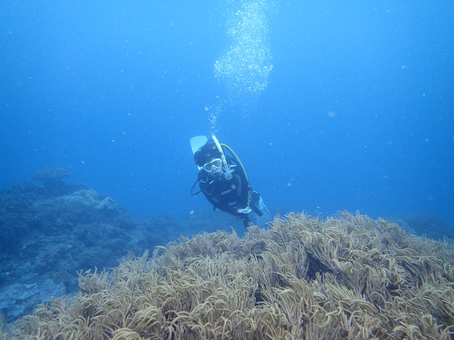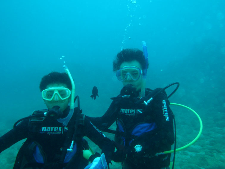 昨日苦戦した耳抜きも、なんとロープ潜行せず、フリー潜行で入ればできるという天才児でした。いろいろ克服して、コース終了!器材を背負って歩く姿もたくましく、すっかりダイバーらしくなりました!