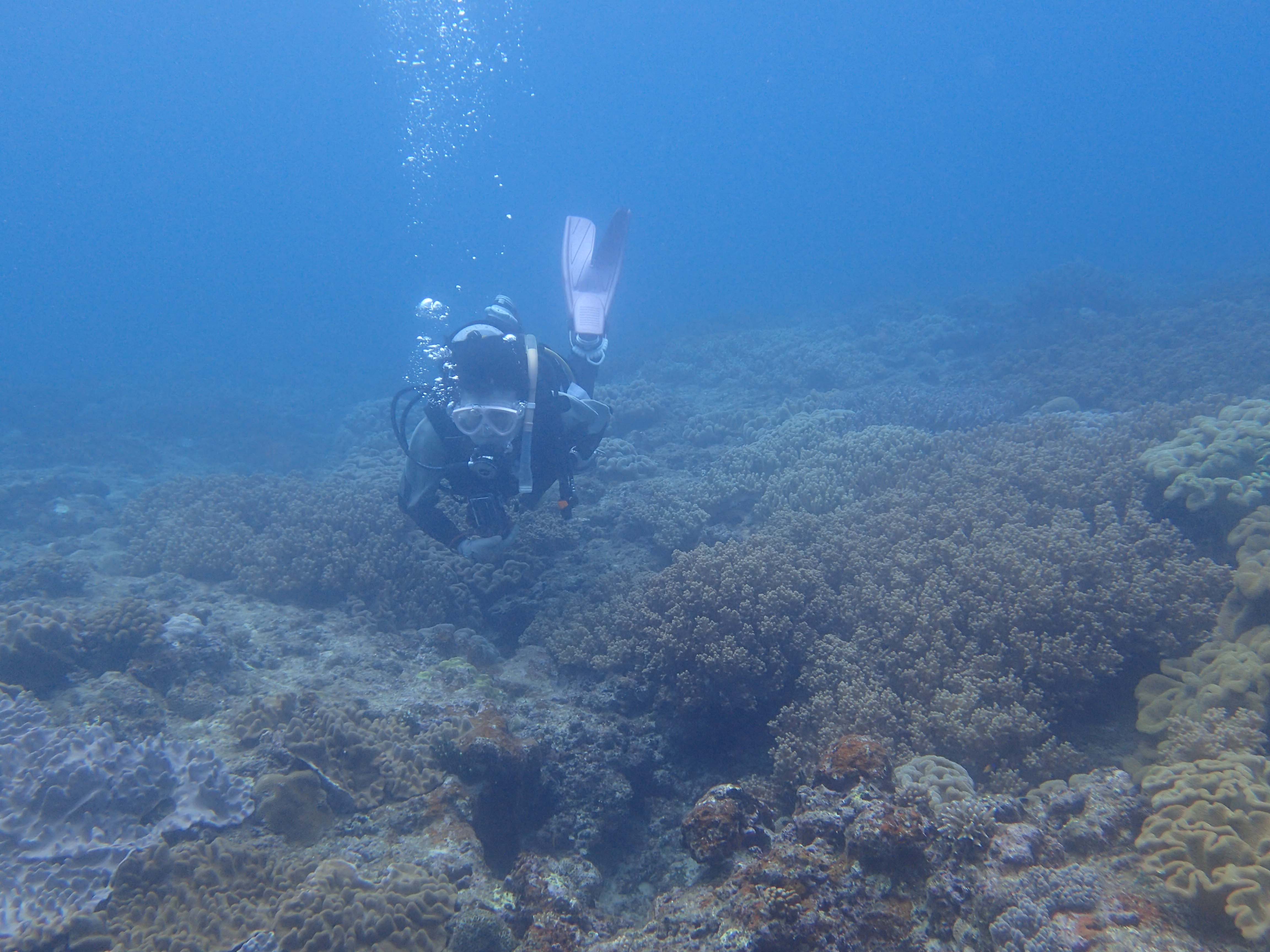 2017.06.18 砂辺ビーチ ファンダイビング ゆかりさん、2日目ものんびりと砂辺ビーチです。 今日はいつもと違うポイントに入ってみましたが、ソフトコーラルだけじゃなく石サンゴも育っていてキレイでしたね(^^) 昨日と違って、風もなく、あたたかく、やっぱり砂辺はいやされますね♪ 耳も抜けるようになってきたし?! 明日は慶良間です(^^♪