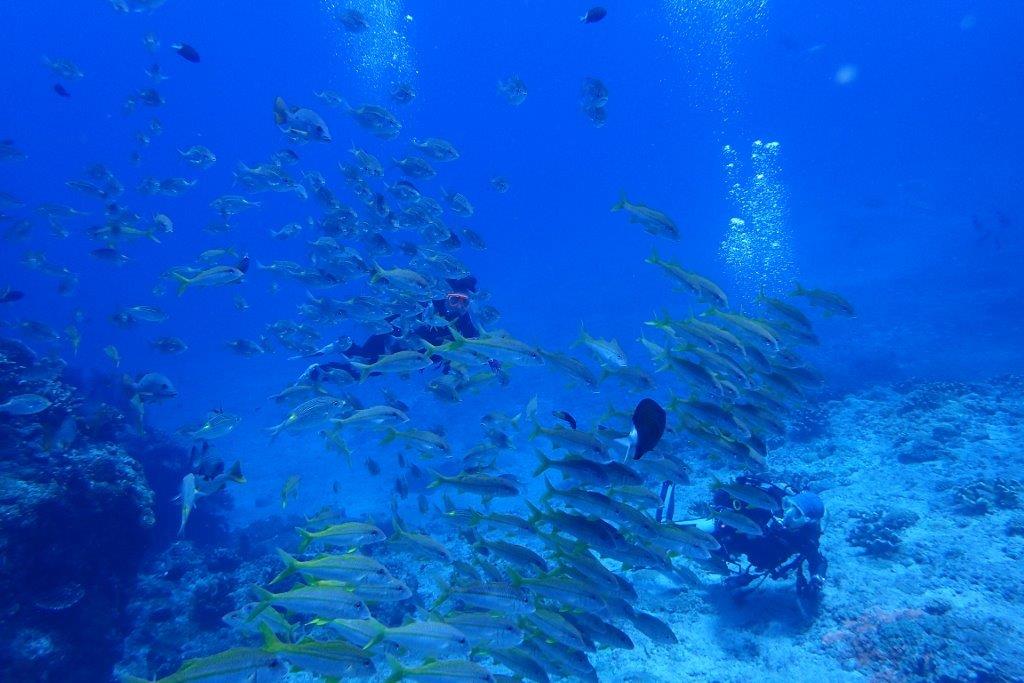 今日は天候も海況もよい慶良間日和でした(^^) カメ・サメ・ロウニン・群れ・・・のんびりと堪能しつつ、激写するおふたりでした(^^♪