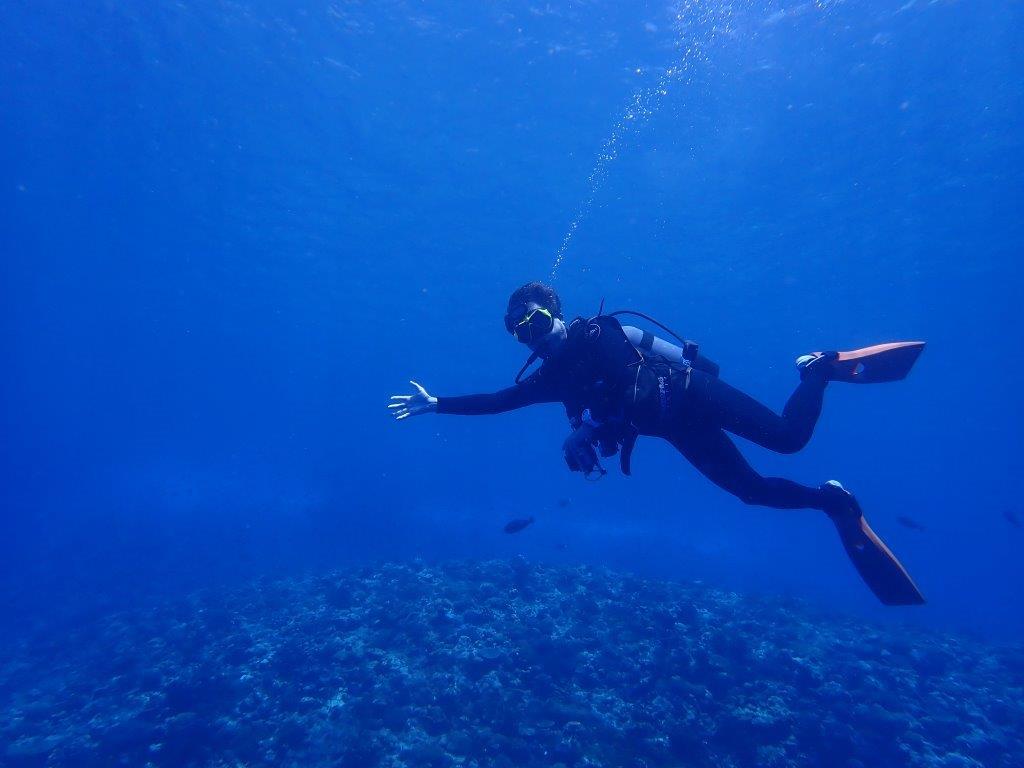 2022.07.08 真栄田岬ビーチ 体験ダイビングコース 今日も初沖縄・初スノーケル・初ダイビングのみくさんと、体験ダイビングコースです。 乗り物酔いしやすいとのことだったので、波酔いが心配でしたが、今日はベタ凪で楽しくラクラクスノーケル。ダイビングは少し緊張してましたが、慣れて楽しんでいただけたようです(^^♪ みくさん、ありがとうございました。また、潜りましょうね~(^^)/