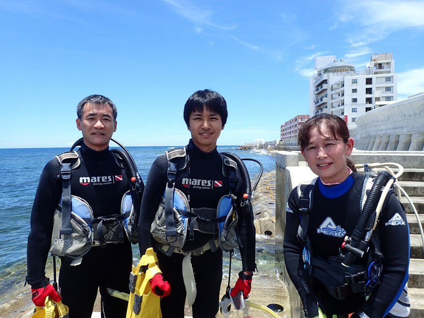 去年、台風のために沖縄ダイビングをキャンセルされたさとみさん。今年は天候に恵まれました! そして、りぴーたーのひでゆきさん&じゅんさん親子もご一緒です。 沖縄らしい夏空の元、のんびりとダイビングしてきました(^^)