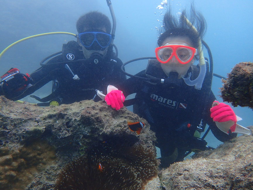 たかこさんはずっと緊張されていたようでしたが、がんばって泳いで生物も観察されてましたよ。きよみつさんがそんなたかこさんを激写(^^) ご夫婦でのダイビング、いかがでしたか。ぜひまたチャレンジしてくださいね。今度はぜひおじょうさんもご一緒に!