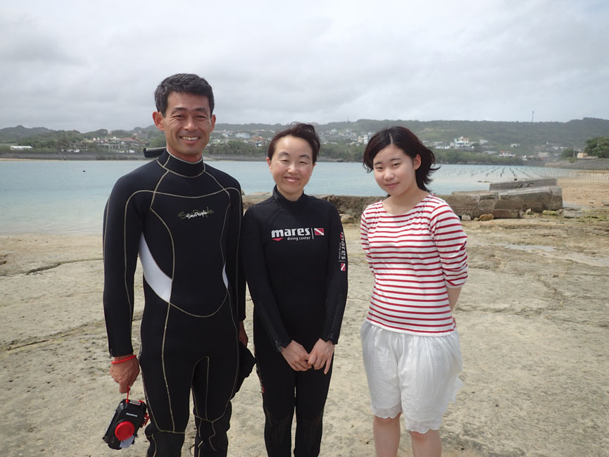 海風りぴーたーのちえさんが同僚のけんとさんとたくやさんを連れて遊びに来てくれました。 そして、きよみつさんがおくさまのたかこさんとおじょうさんを連れてきてくれました。というわけで、けんとさんとたくやさん、たかこさんは体験ダイビング。ちえさんときよみつさんがそれぞれの付き添い。きよみつさんのおじょうさんは陸での付き添い。と、にぎやかに行ってきました。