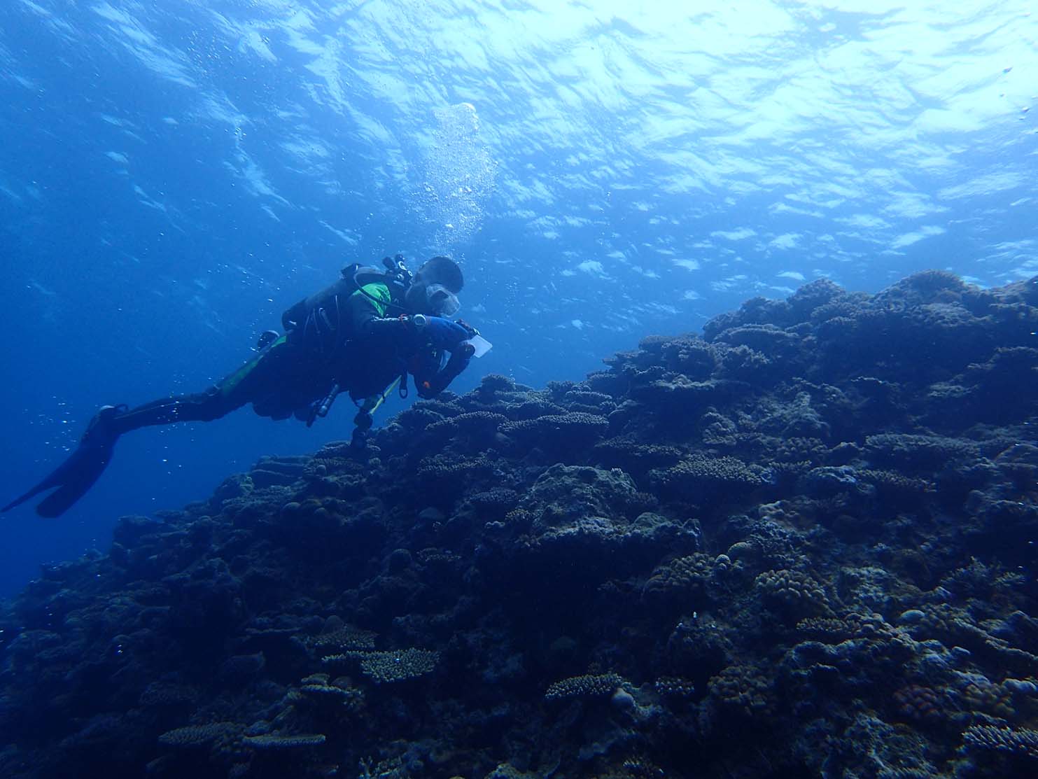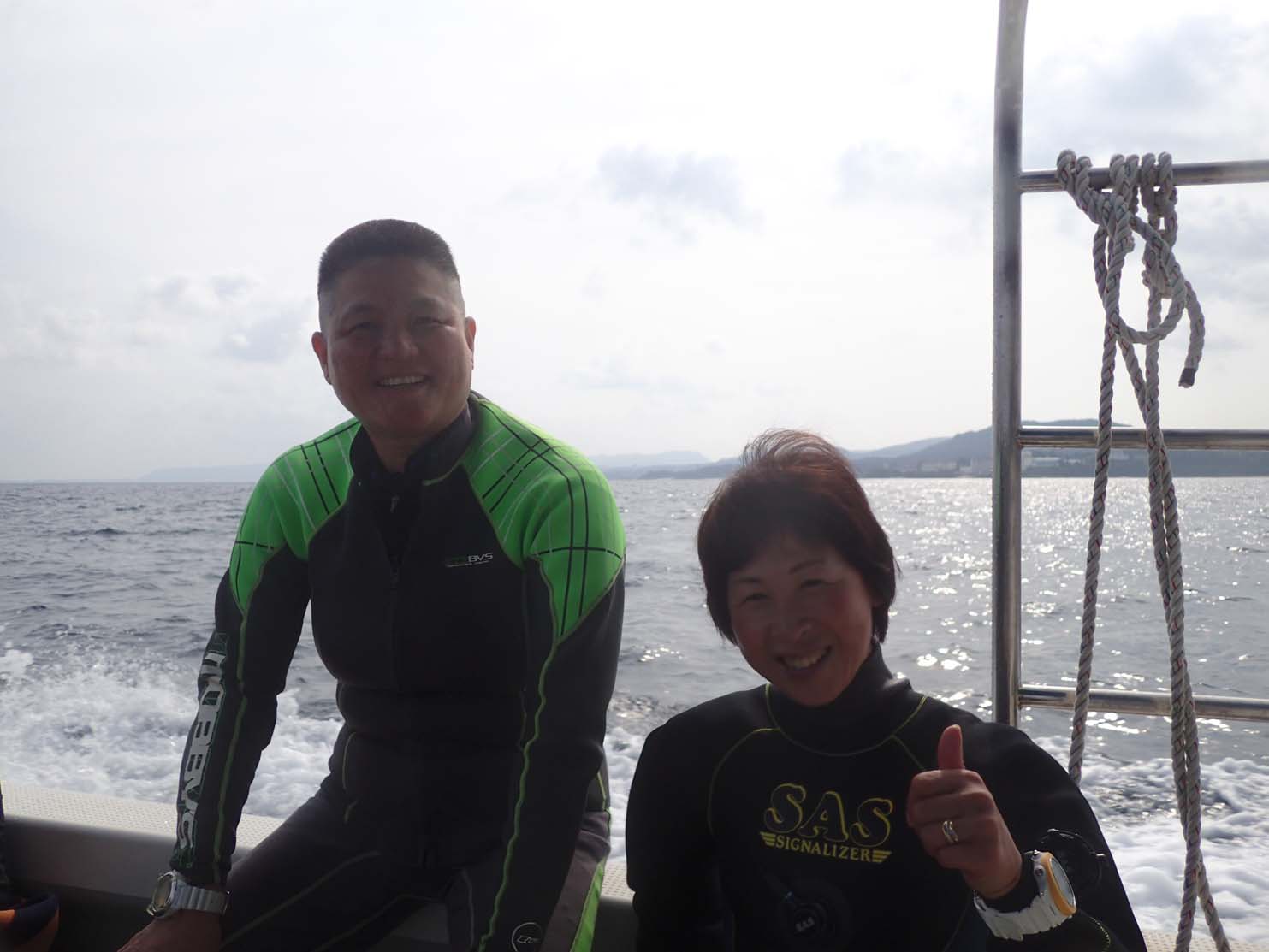 今日はご近所だいばーず・あつこさんとゆみこさんと、万座へ行ってきました。晴れて穏やかなダイビング日和。そして、あつこさんは1mmスーツ、ゆみこさんはドライスーツです(^o^)
